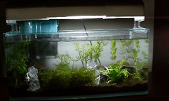 所詮、横幅45cmなので、水景を楽しむ…と言うのは出来ないが、小さめの流木と石を置くぐらいは出来る。その間にウィローモスのマットを引くとなかなか良い感じとなった。(自画自賛)